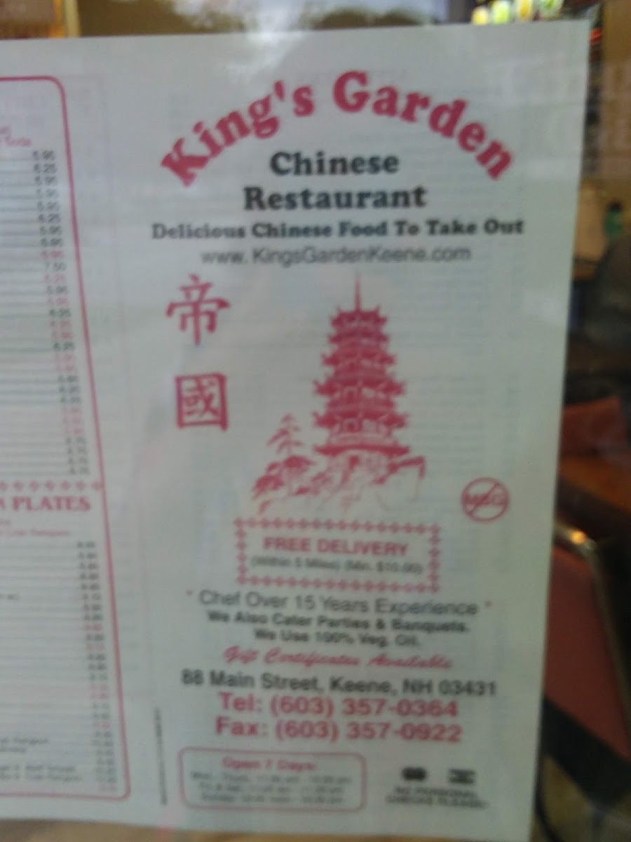 Welcome to King's Garden, a beloved family-owned restaurant nestled in the heart of Keene, NH. With a menu brimming with delightful options, they cater to every craving, from zesty Edamame ($4.95) to crispy Fried Dumplings ($9.95). King's Garden excels in delivering generous portions and fresh ingredients, as highlighted by happy customers who rave about the Shrimp with Broccoli and Pork Egg Rolls.